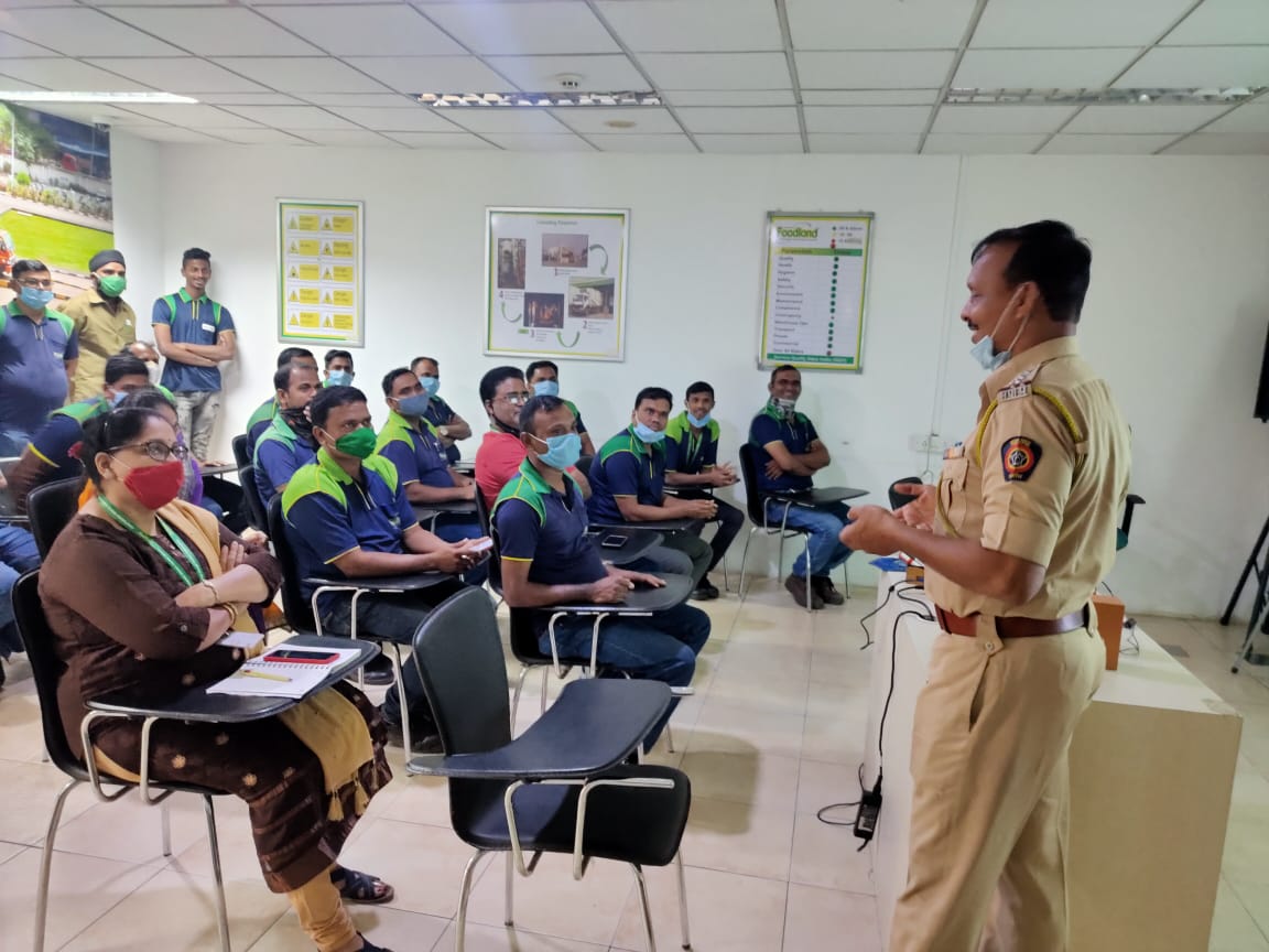 Shri. KK Vishvakar Senior Police Inspecter of Traffic Police Kalamboli, Navi Mumbai sharing his thoughts at R K Foodland and briefing drivers on safe motoring. Date 12th Feb’2021, occassion of Road Safety Month.